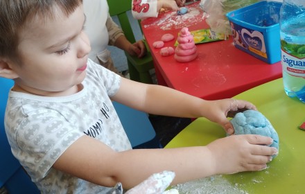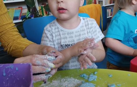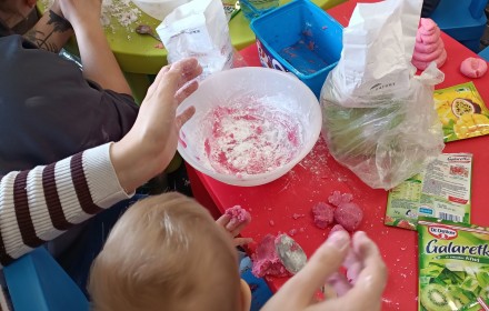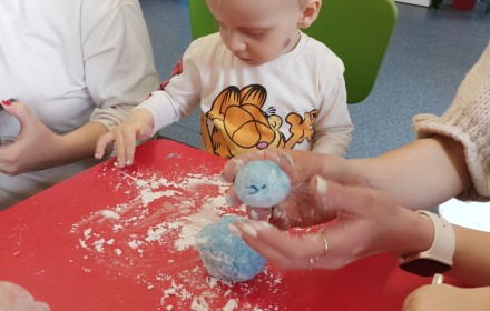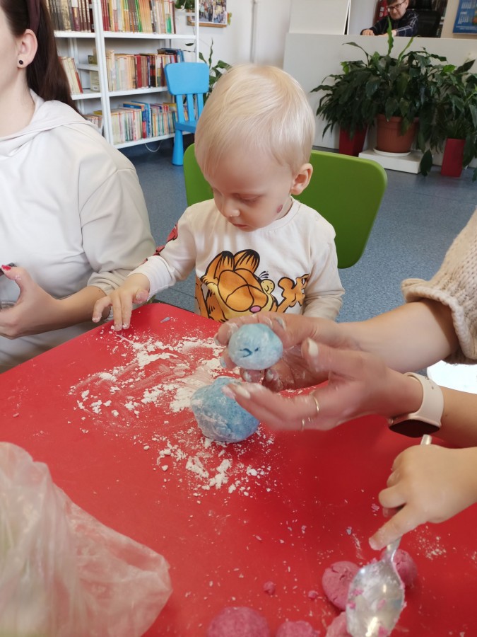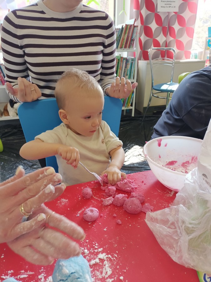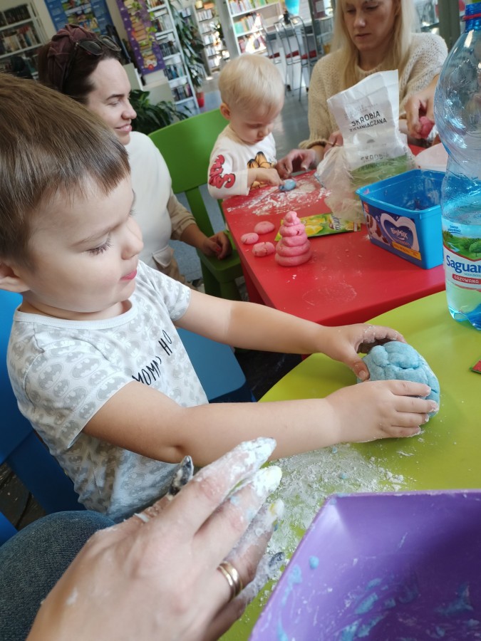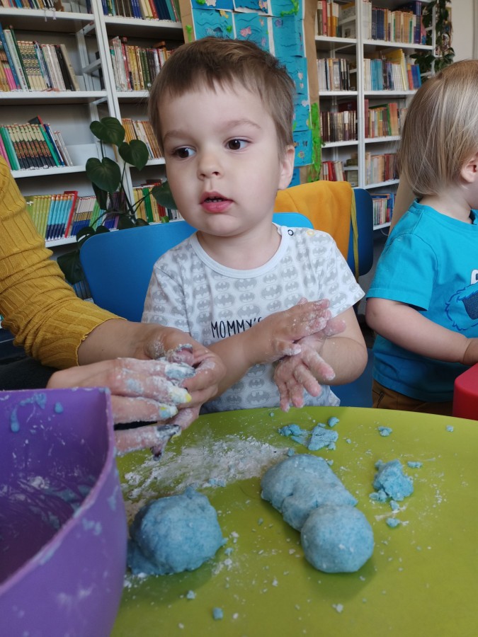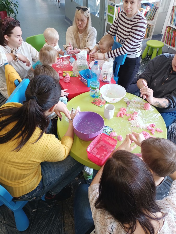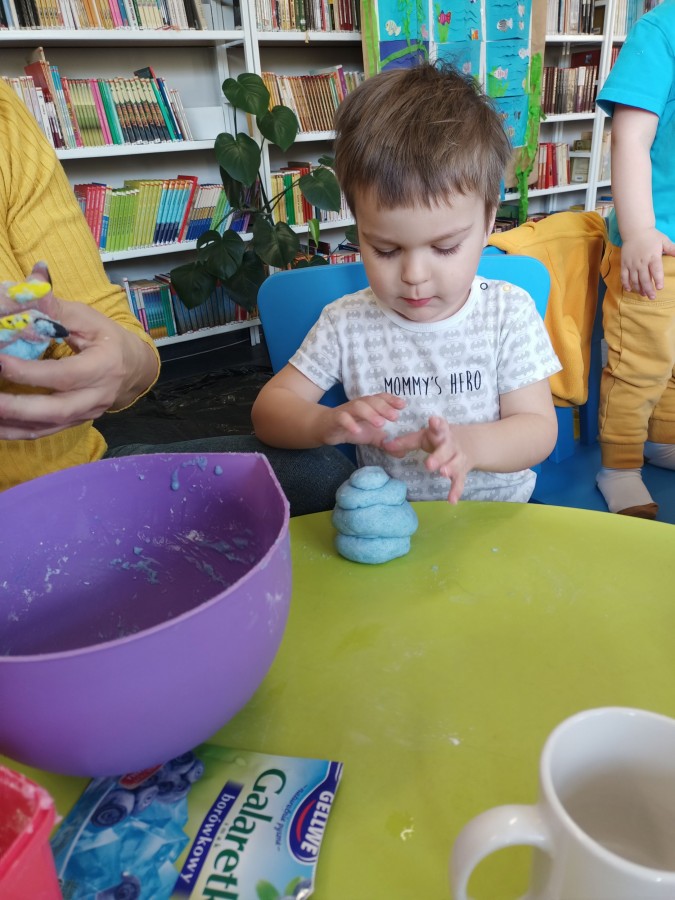 10 kwietnia w Filii nr 10 odbyły się zajęcia Grupy Zabawowej, podczas których tworzyliśmy masę do lepienia różnych kształtów. Tym razem tą masą była żelkolina, wykonana z galaretki, mąki i odrobiny wody. Dzieci z dużym zaangażowaniem i kreatywnością tworzyły różne kształty i postacie ?
