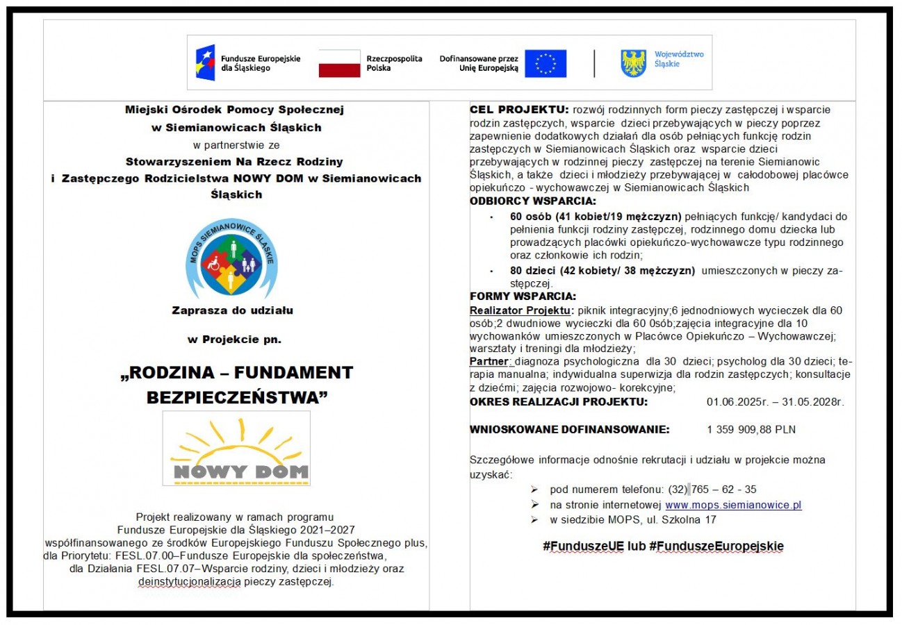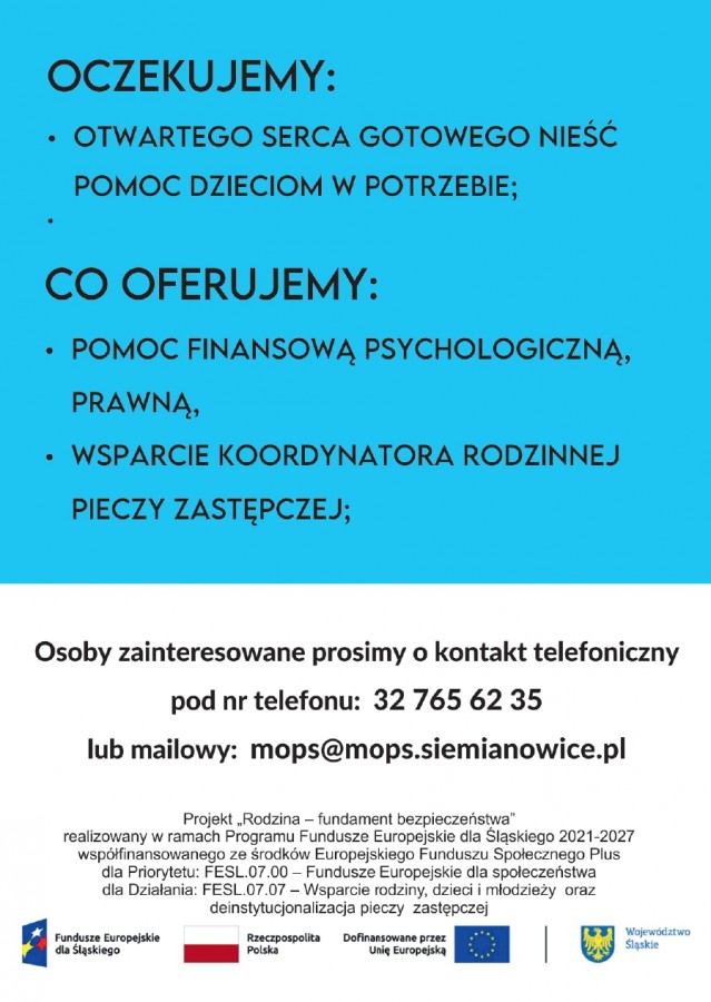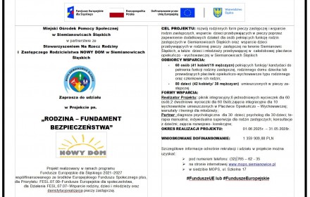CEL PROJEKTU: rozwój rodzinnych form pieczy zastępczej i wsparcie rodzin zastępczych, wsparcie dzieci przebywających w pieczy poprzez zapewnienie dodatkowych działań dla osób pełniących funkcję rodzin zastępczych w Siemianowicach Śląskich oraz wsparcie dzieci przebywających w rodzinnej pieczy zastępczej na terenie Siemianowic Śląskich, a także dzieci i młodzieży przebywającej w całodobowej placówce opiekuńczo - wychowawczej w Siemianowicach Śląskich.