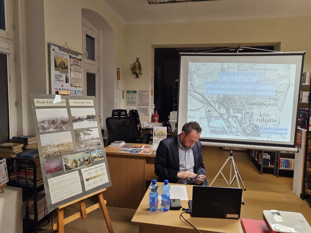 Wczoraj w Filii nr 5 odbyło się bardzo wartościowe spotkanie z doktorem Marcinem Wądołowskim poświęcone historii regionu Laurahütte. Uczestnikom prelekcji przybliżone zostały dzieje naszego miasta uchwycone na fotografiach, które każdy odwiedzający naszą Filię może oglądać przez cały listopad w ramach wystawy ,,Moja Laurahütte- wczoraj i dziś”.