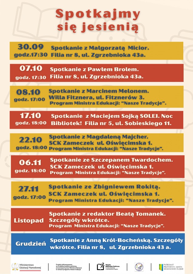 Przed nami wyjątkowy sezon spotkań autorskich - pełen inspiracji, rozmów o książkach i odkrywania naszych literackich (i nie tylko!) tradycji. Część wydarzeń odbywa się w ramach projektu „Nasze tradycje" realizowanego ze środków Ministerstwa Edukacji. To doskonała okazja, by wspólnie zanurzyć się w kulturze, historii i słowie pisanym - w najlepszym towarzystwie autorów, których książki poruszają i zostają z czytelnikiem na długo. Śledź nasz harmonogram - będzie się działo!