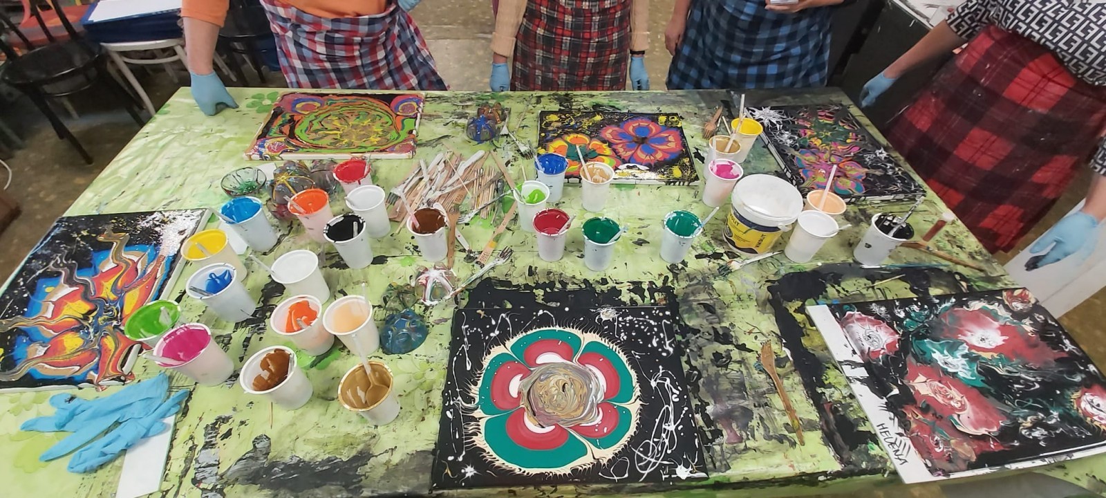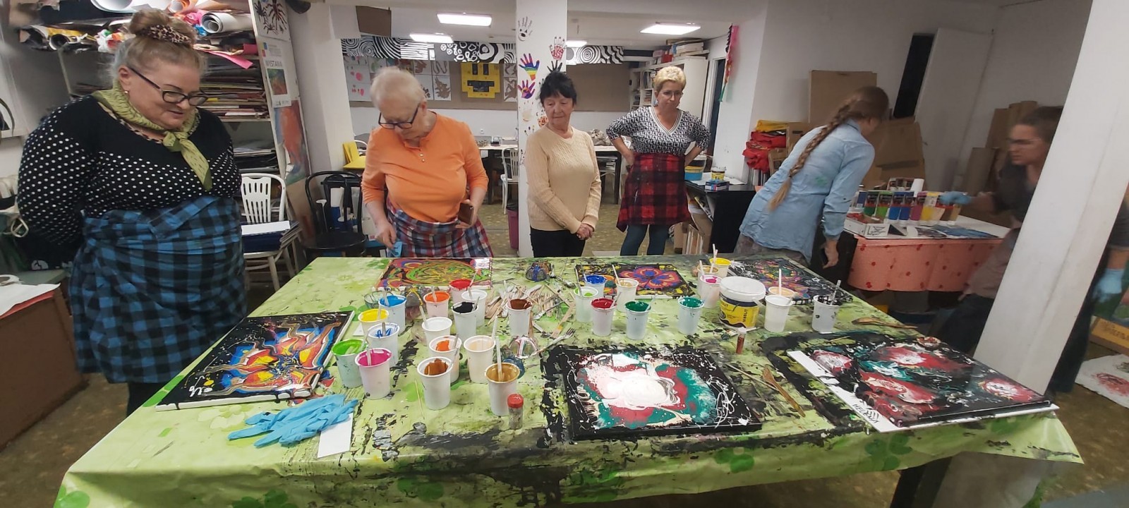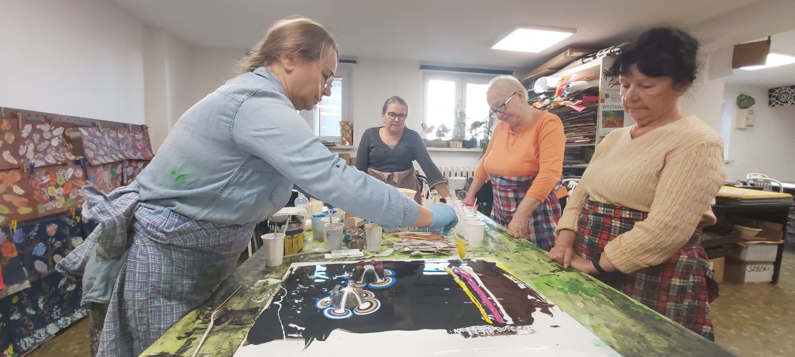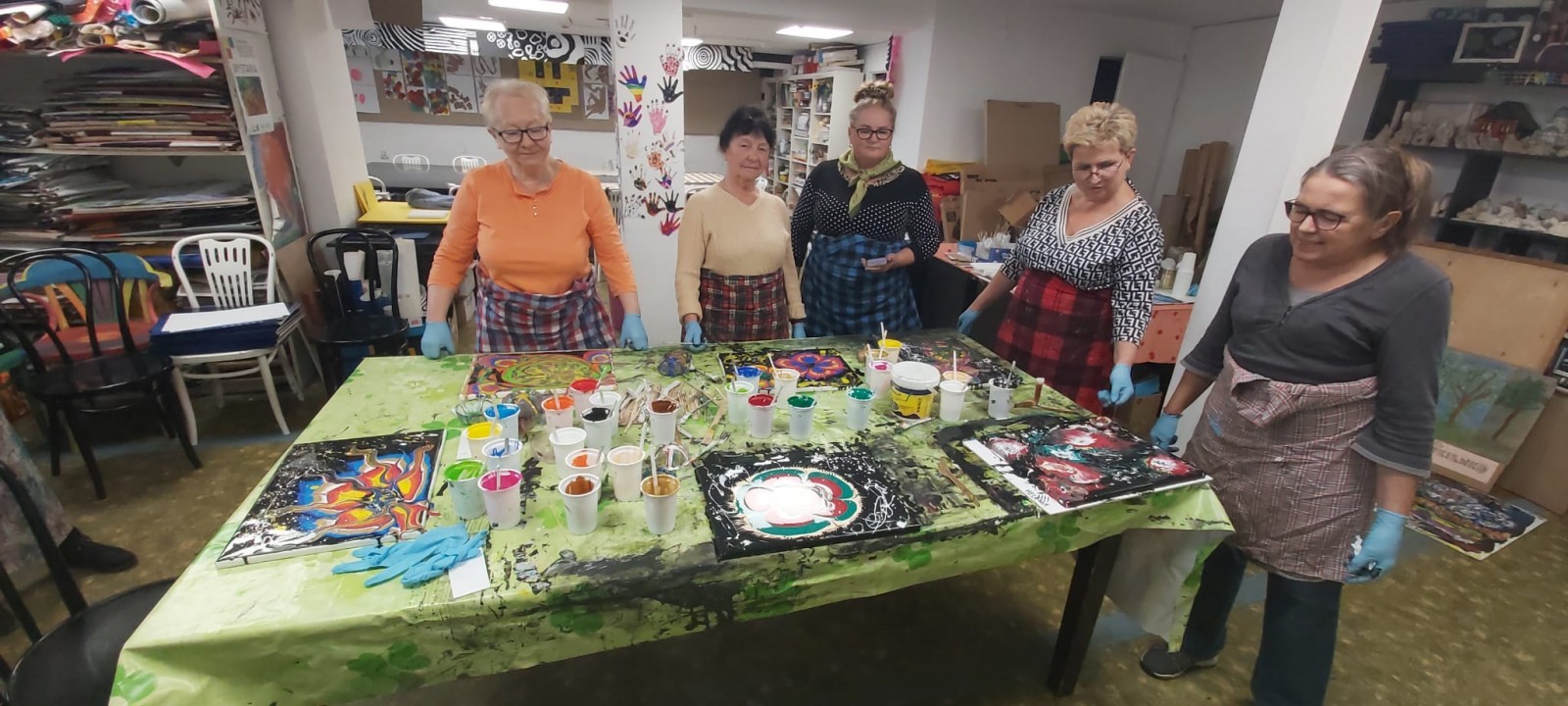 Tym razem uczestnicy "Silversów w Bibliotece" wzięli udział w warsztatach pt. "Pouring - tańczące kolory". Pouring, to technika nazywana też malowaniem przez wylewanie, która polega na tworzeniu abstrakcyjnych obrazów poprzez rozlewanie farb zmieszanych ze specjalnym medium na wcześniej przygotowany podkład. Wydarzenie poprowadziła Dorota Micior-Gajewska w Pracowni Plastycznej "Okienko" w SCK Bytków. Za pomocą farb akrylowych uczestniczki wyczarowały abstrakcyjne, pełne barw obrazy.
