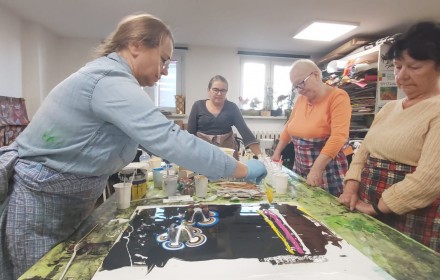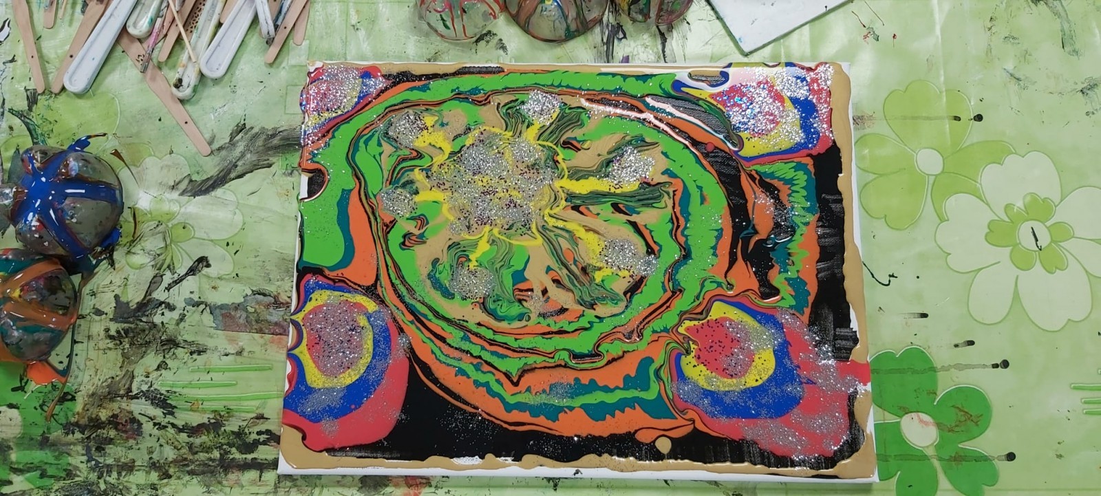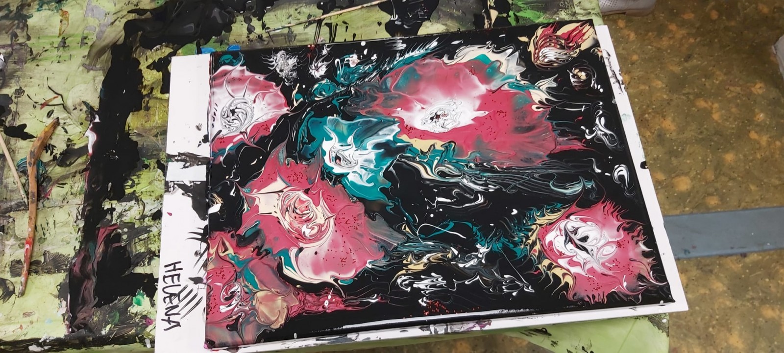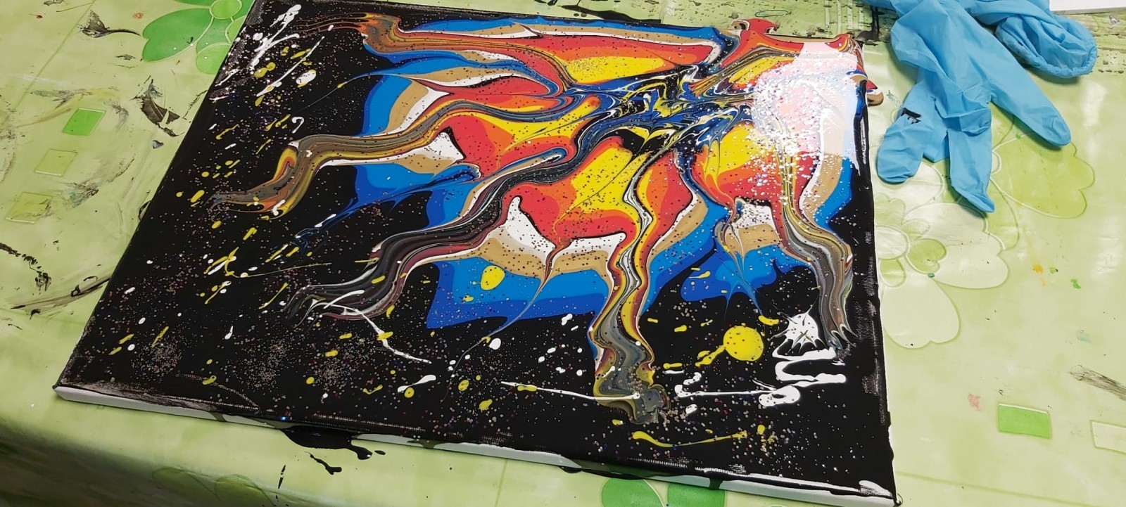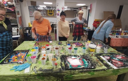 Tym razem uczestnicy "Silversów w Bibliotece" wzięli udział w warsztatach pt. "Pouring - tańczące kolory". Pouring, to technika nazywana też malowaniem przez wylewanie, która polega na tworzeniu abstrakcyjnych obrazów poprzez rozlewanie farb zmieszanych ze specjalnym medium na wcześniej przygotowany podkład. Wydarzenie poprowadziła Dorota Micior-Gajewska w Pracowni Plastycznej "Okienko" w SCK Bytków. Za pomocą farb akrylowych uczestniczki wyczarowały abstrakcyjne, pełne barw obrazy.