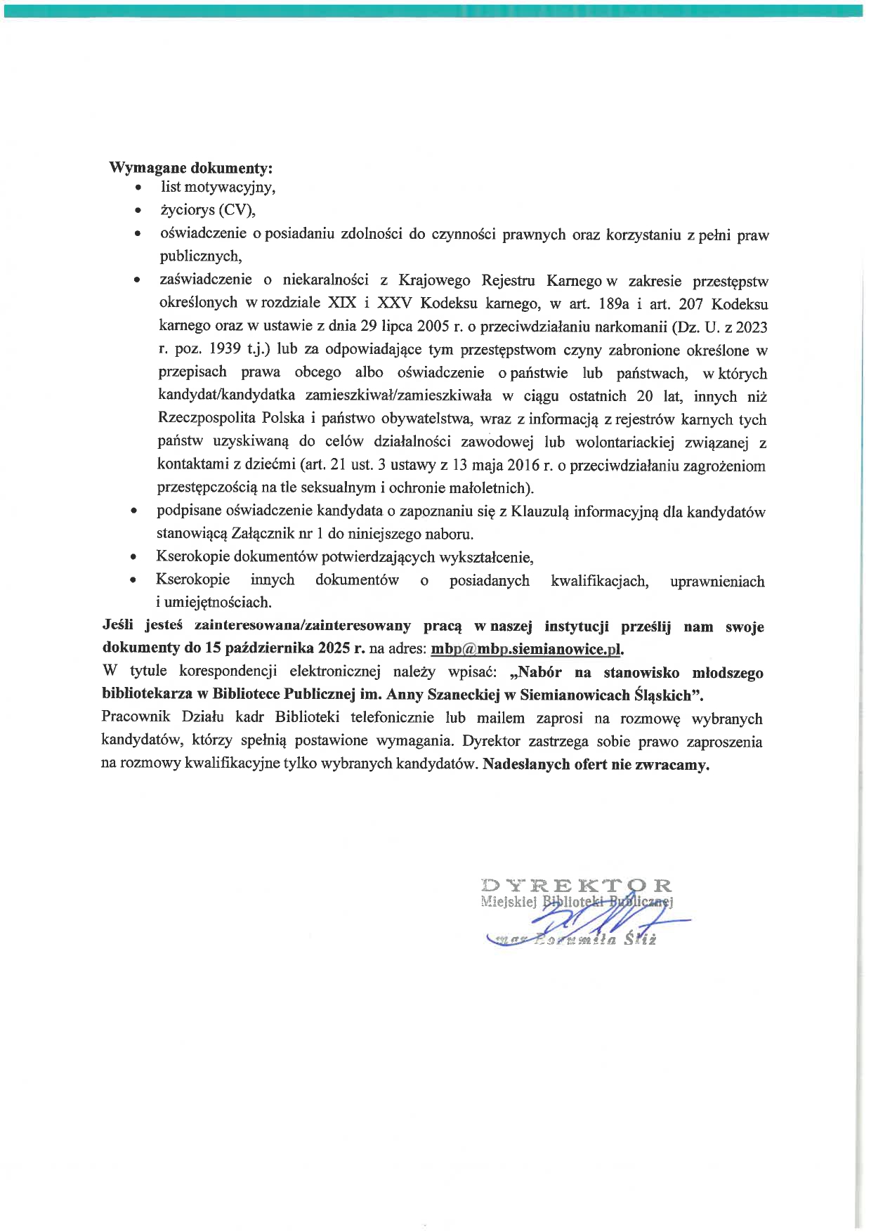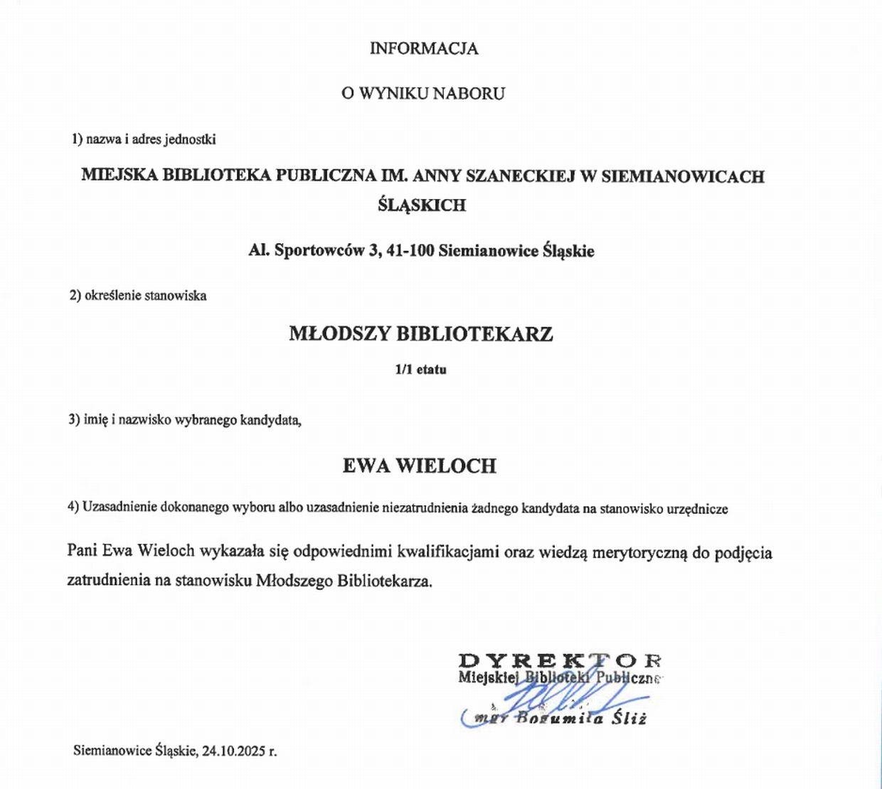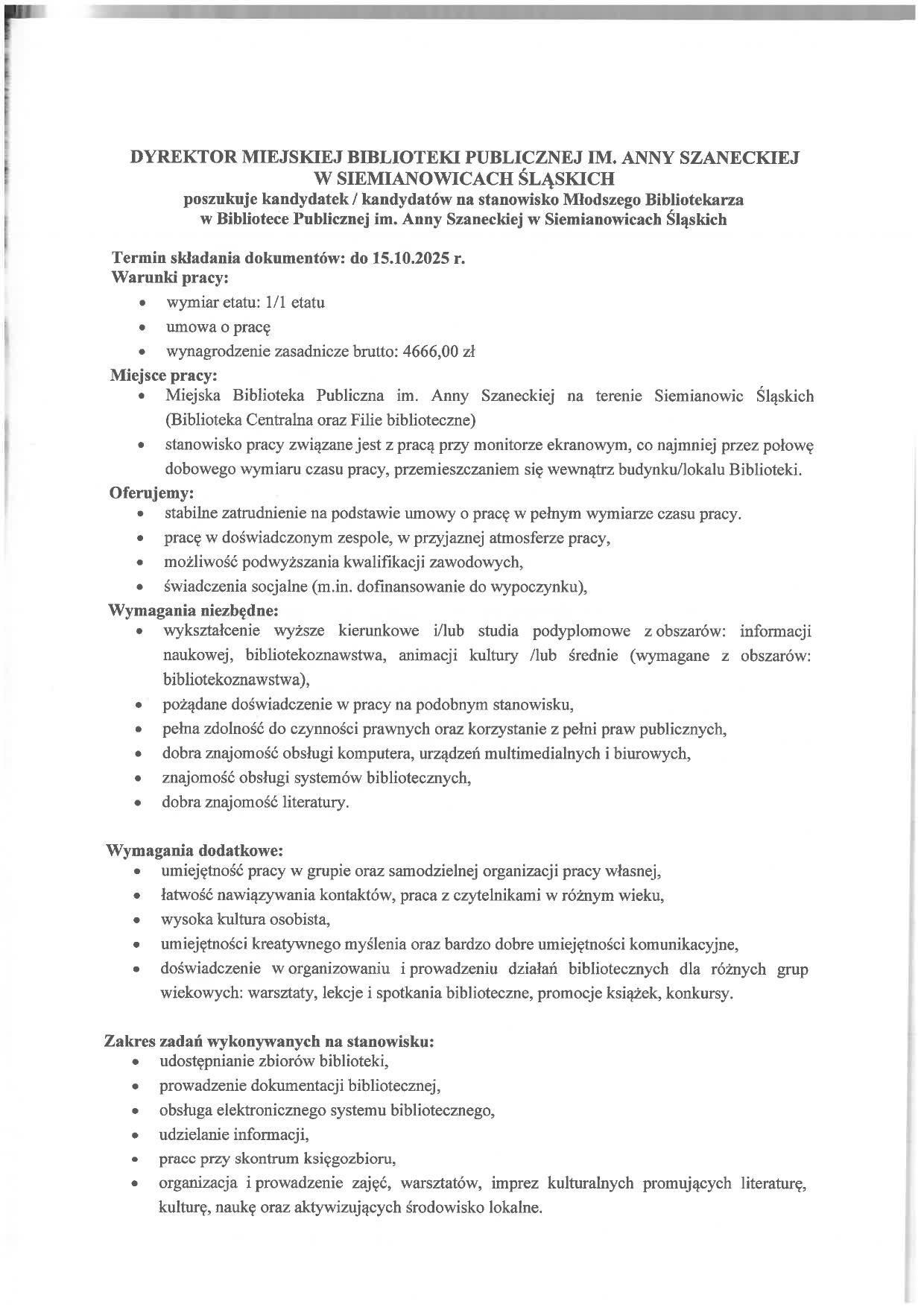 Strona główna O nas Nabór na wolne stanowiska Nabór na stanowisko: Młodszy Bibliotekarz Nabór na stanowisko: Młodszy Bibliotekarz