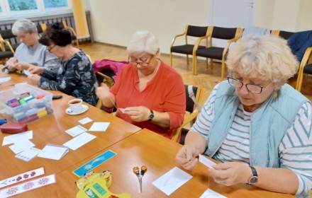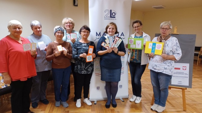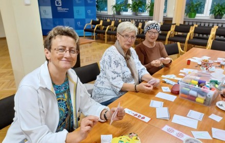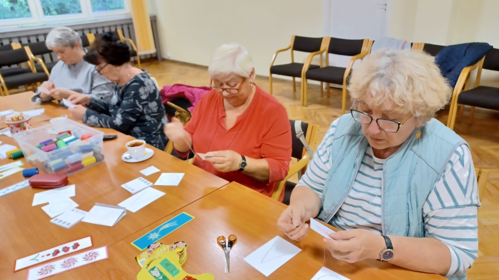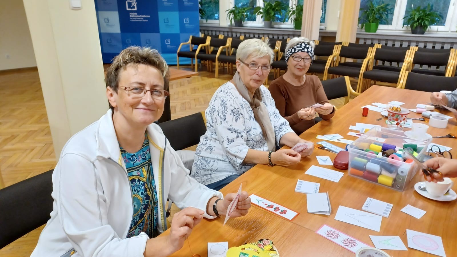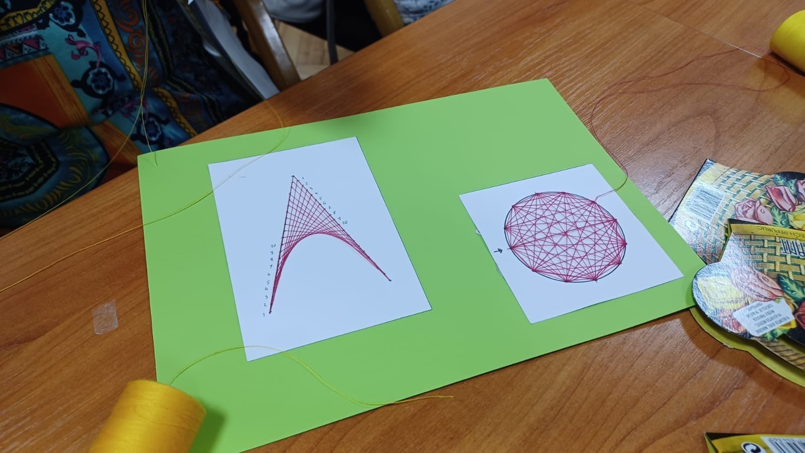 We wtorkowe popołudnie w cudowny sposób udało się połączyć matematykę z sztuką. Uczestnicy projektu "Cyfrowy Senior" zobaczyli jak można otaczającą nas rzeczywistość przelać na papier w postaci figur geometrycznych. Na pierwszych warsztatach "Haftu matematycznego" nauczyli się wykonywać podstawowe wzory - kąt i koło. Powstały pierwsze prace malowane nitką, a w głowach rodziły się pomysły na projekty zakładek do książek, które będą tworzone w przyszłym tygodniu tj. 27 września 2022 r. Projekt realizowany wspólnie z II Liceum Ogólnokształcące im. Jana Matejki w Siemianowicach Śląskich